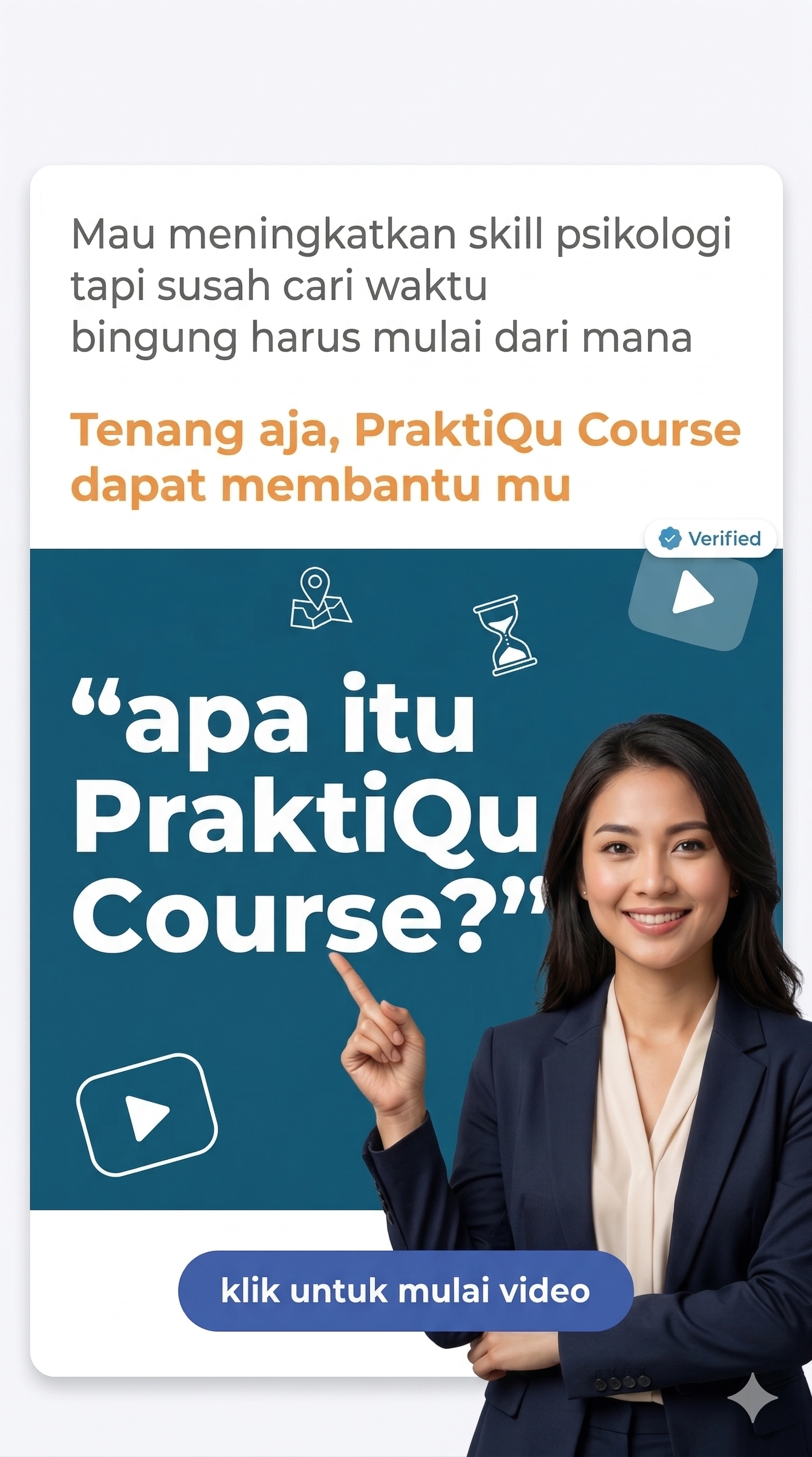 PraktiQu bukan sekadar platform belajar, tapi pendamping perjalananmu dari tantangan personal, pengembangan profesional, hingga praktik nyata. Dibentuk oleh para Psikolog yang berpengalaman sehingga tahu betul kebutuhan kamu untuk berkembang Sebagai Profesional, sebagai Individu.